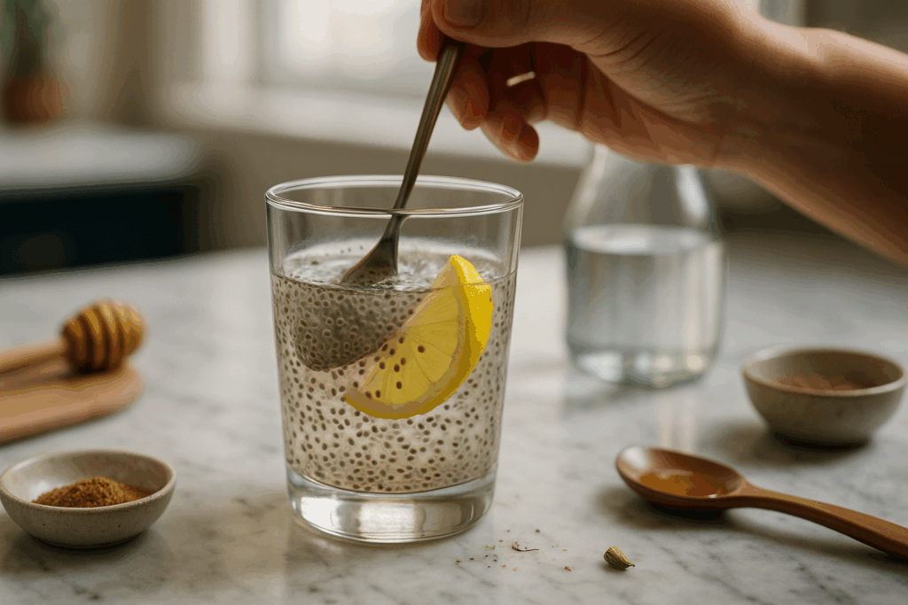 Mix the chia seeds into water and let sit for 15 minutes until they swell. Add lemon juice and stir. Drink 20–30 minutes before meals to reduce appetite and improve fullness.