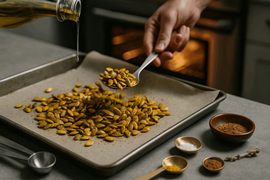 Toss seeds with oil and spices. Spread on a baking tray and roast at 160°C (325°F) for 10–15 minutes until lightly golden. Cool and store in an airtight jar. Perfect for mid-afternoon energy or as a crunchy salad topping.