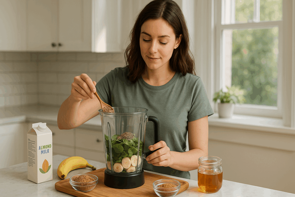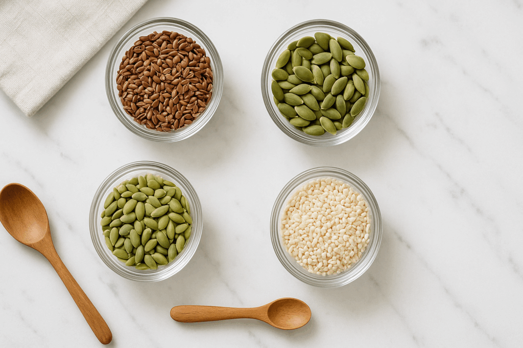 Flax seeds, pumpkin seeds, walnuts, and leafy greens — all rich in omega-3s, zinc, and antioxidants.