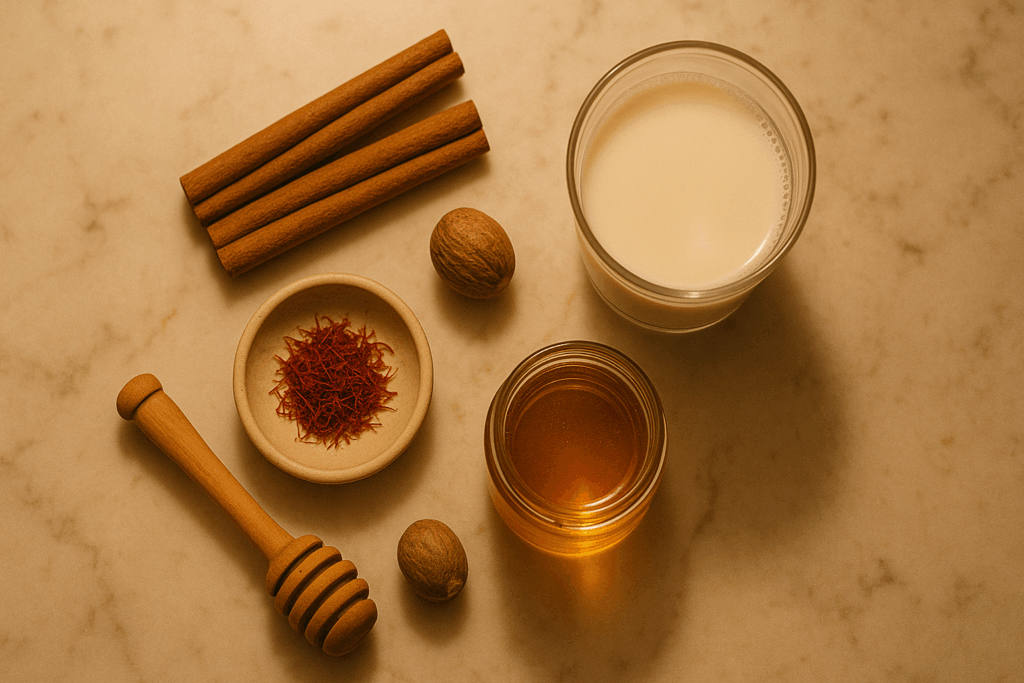 Warm milk and add saffron, cinnamon, and nutmeg. Stir well and let steep for 5 minutes. Add honey and sip slowly before bed.