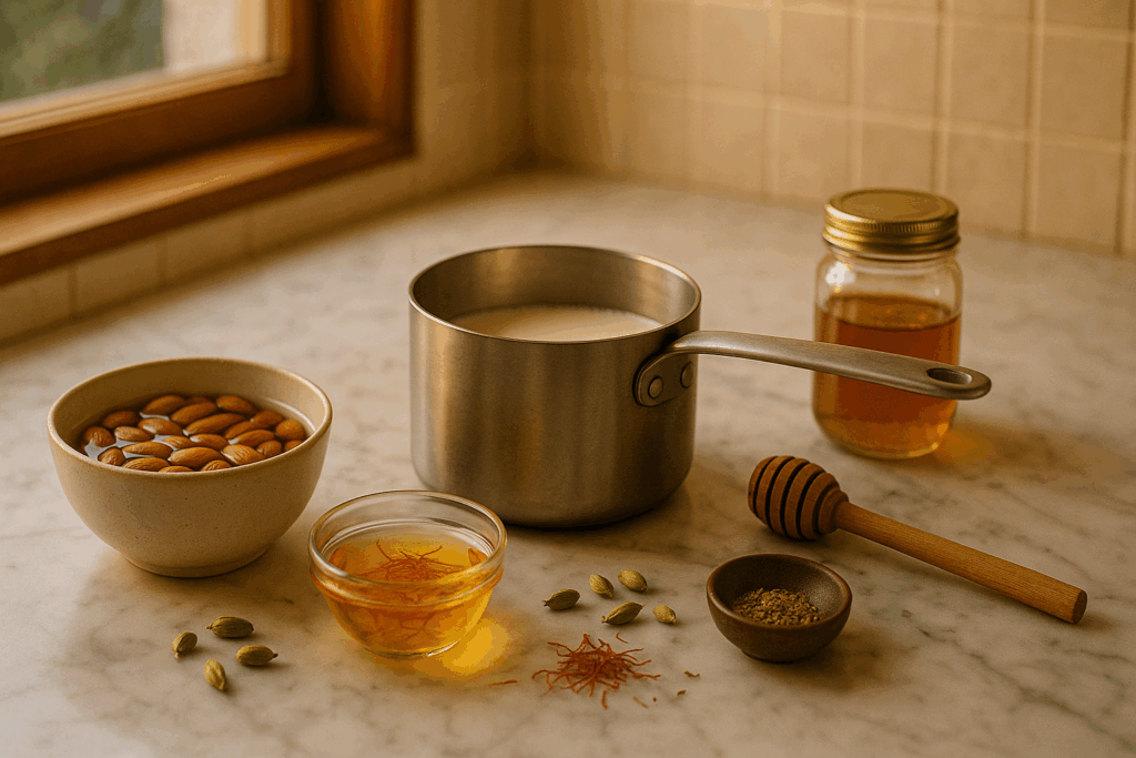 Soak saffron in 1 tablespoon warm water for 10 minutes. Blend milk, almonds, and saffron water, then warm gently (do not boil). Add honey and cardamom before serving.