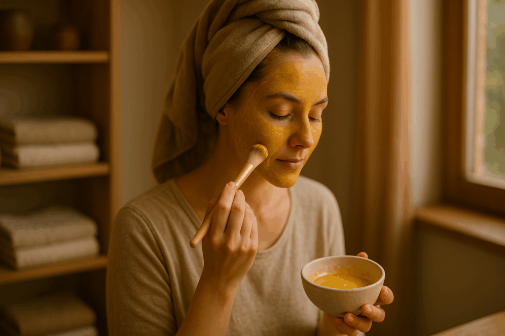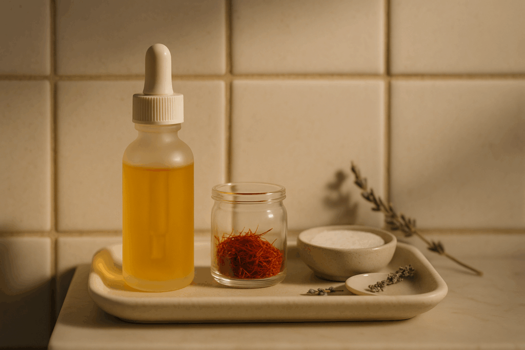 Soak saffron in oil for 24 hours. Massage 2–3 drops onto clean skin at night. This serum deeply hydrates, repairs, and supports overnight skin regeneration.