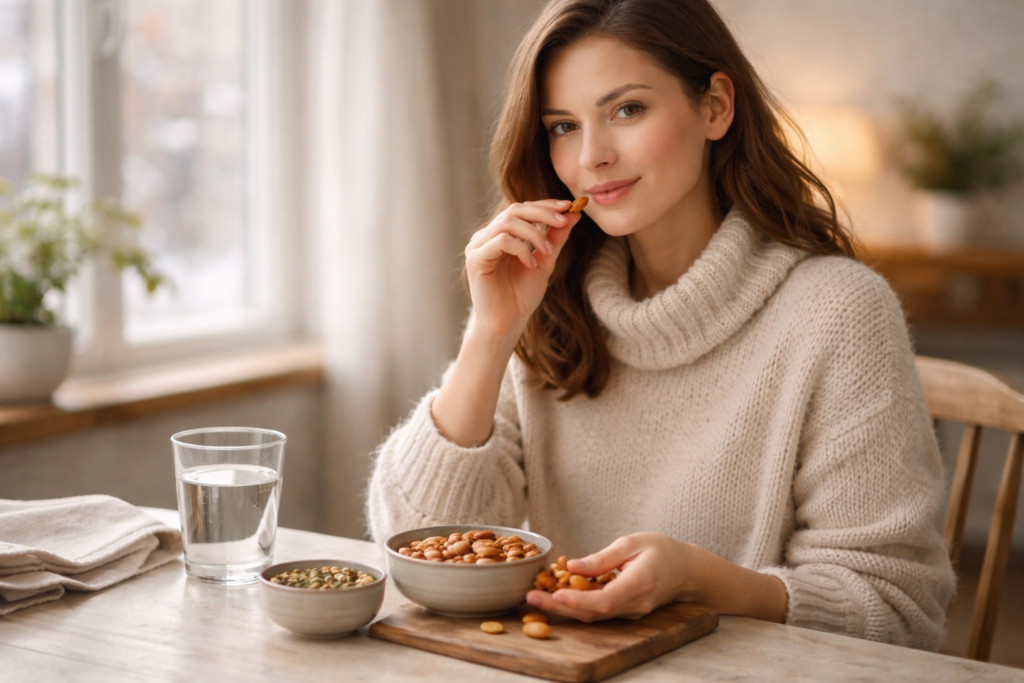 Their high vitamin E content helps repair damaged skin, improve elasticity, and maintain moisture. Healthy fats strengthen the skin barrier, preventing water loss in cold weather. Magnesium supports stress regulation, which directly affects skin clarity and hormonal balance.