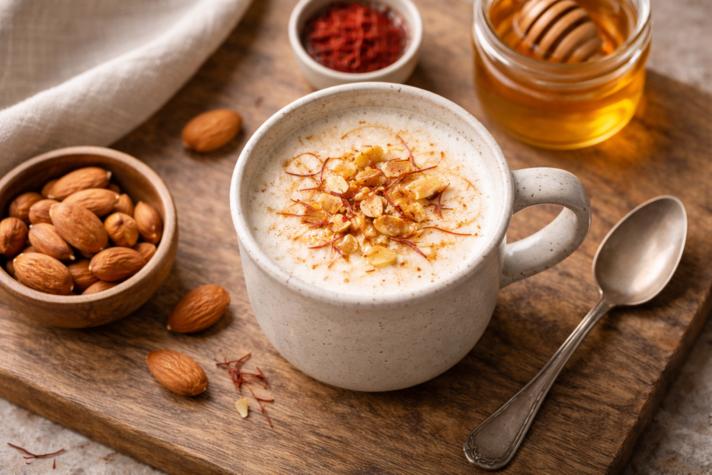Blend almonds with warm milk, add saffron and honey, and drink at night.