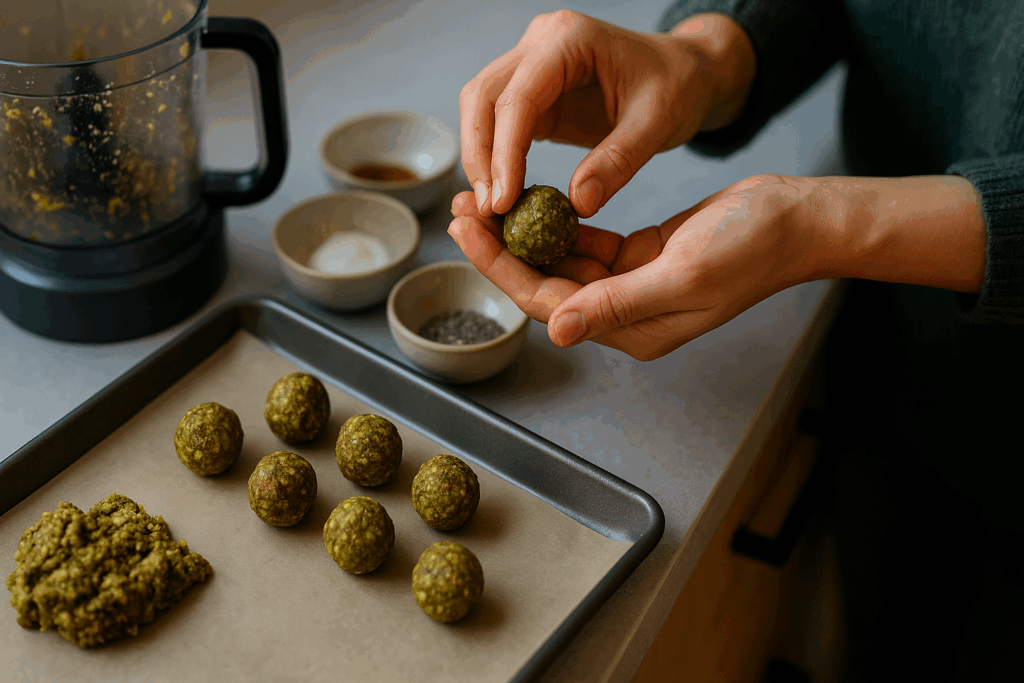 Blend all ingredients in a food processor until dough-like. Roll into small balls and refrigerate. Enjoy 1–2 daily for a brain-boosting, hormone-friendly snack.